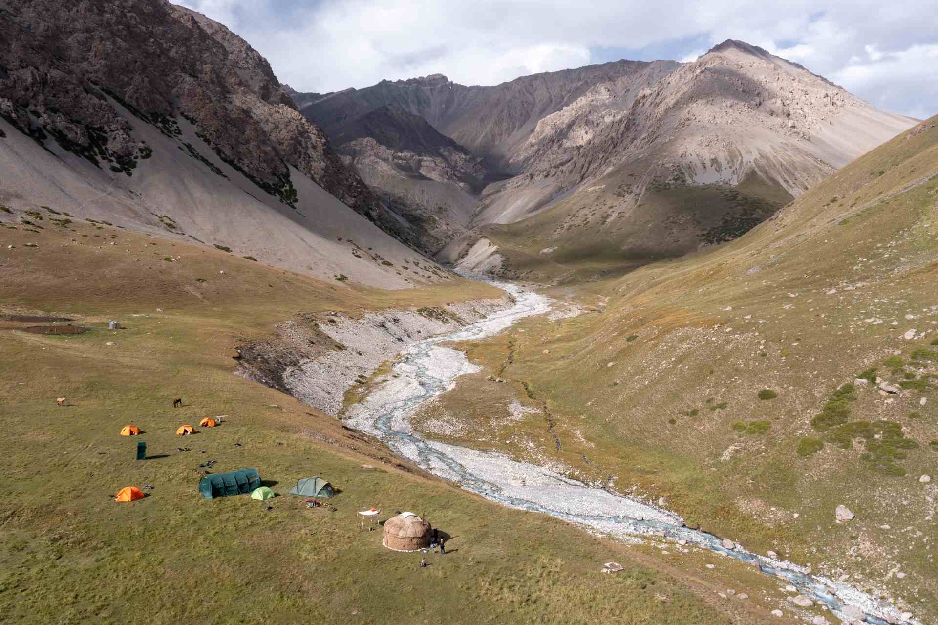 Today, we will spend the entire day trekking through the stunning and wild landscape of the Sary-Mogol Valley. The trail leads through a deep gorge with a breathtaking waterfall. We will set up our camp near a nomadic yurt at an altitude of 3,330 meters above sea level.